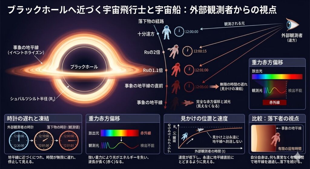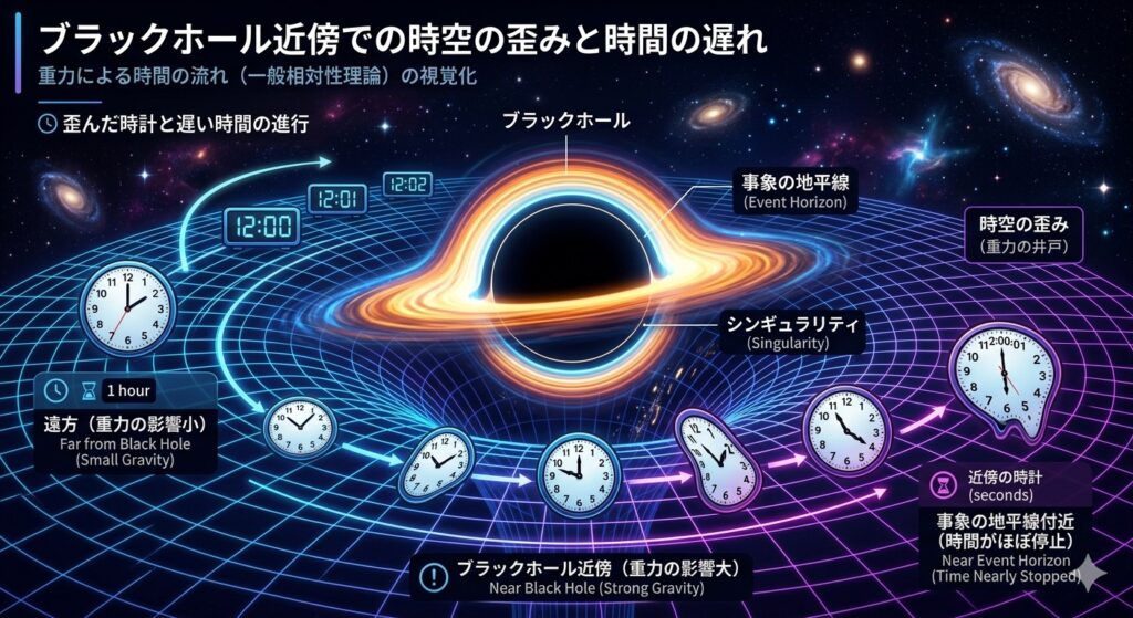 ブラックホールの近くでは、重力が強すぎるため時間の進み方が変わります。