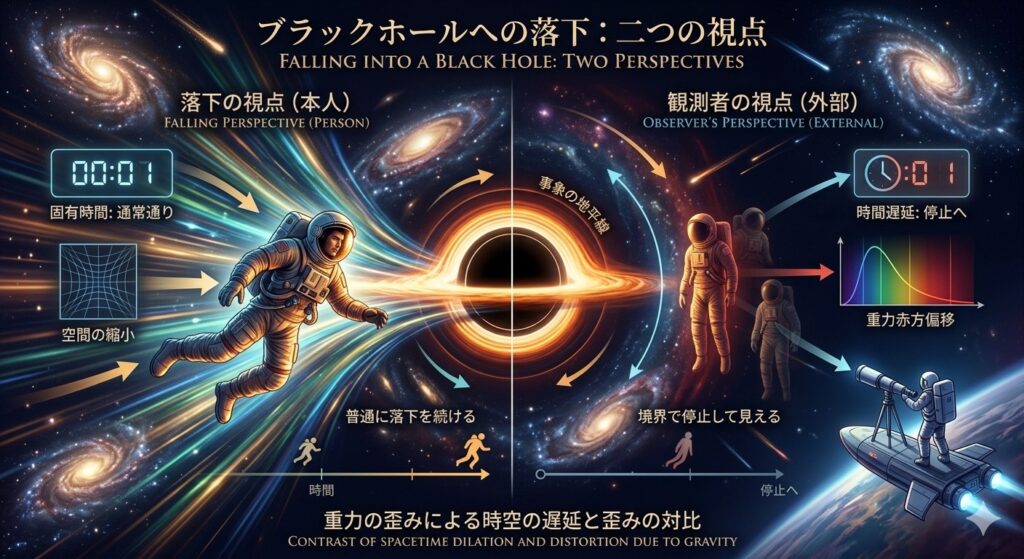 事象の地平線を越えると「見た目は普通なのに、物理法則が完全に変わる」状態に入ります。